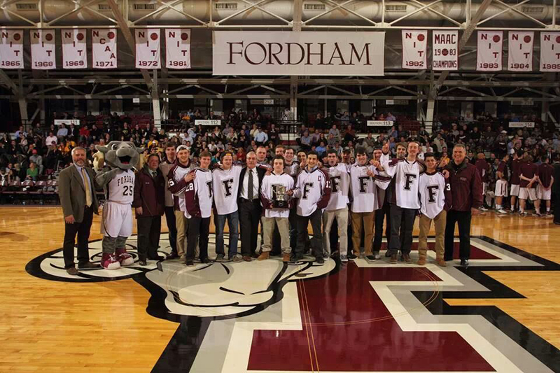 Mike Roberts (Club Sports Director), The Ram Mascot, Andrew Mola (GM), John Brabazon, Marty Bartoszewicz, Mike Roche, Kevin McCormack, Dave Roach (Fordham Athletic Director), Ryan Flood, Pat Killion (holding trophy), Will Holmes, Ben Boltz, Mike Fadda, John Fox, Jackson Landry, Chris Zito, Nick Guberti, Jesse De la rama, Billy Lane, Zack Olah, John Oddo, Rich Guberti (Head Coach)