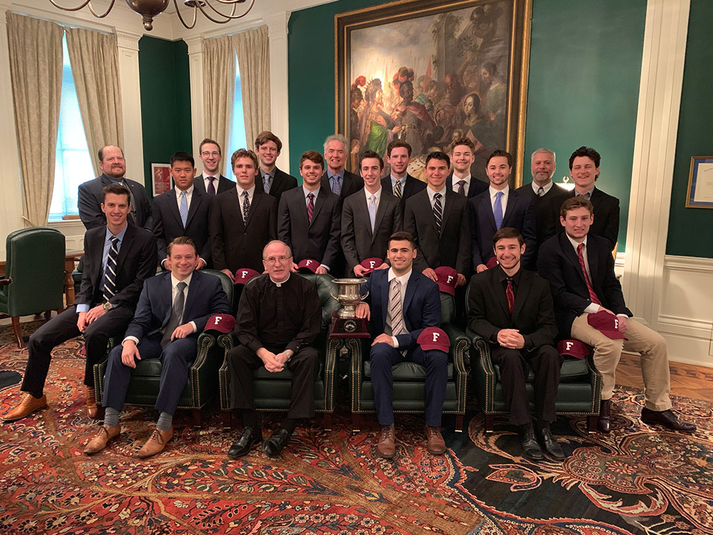 Front left to right: Austin O'Malley, Anthony DiPerri, Father McShane (Fordham President), Mike Gamby, Sean Johnson, Brendan Crowley